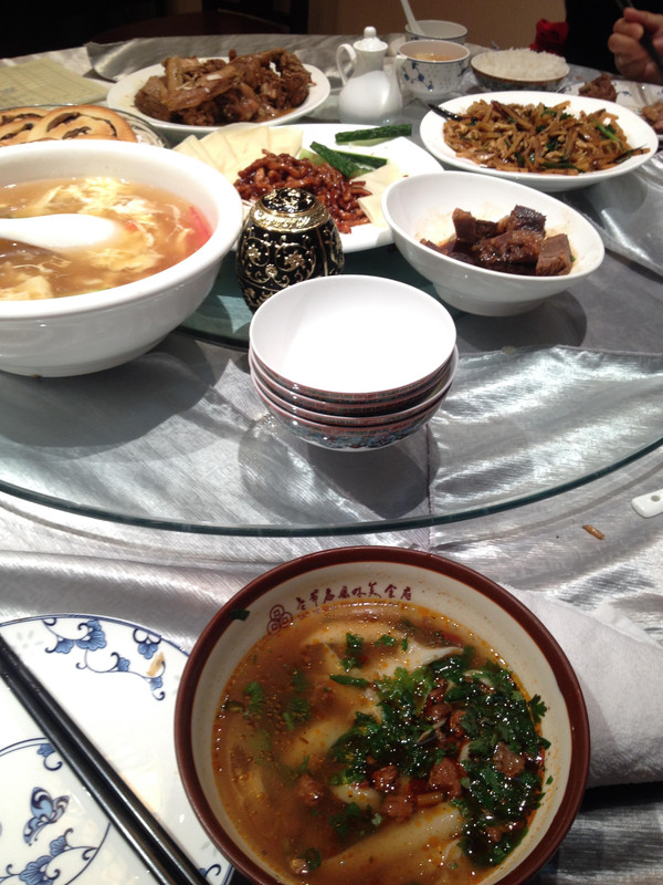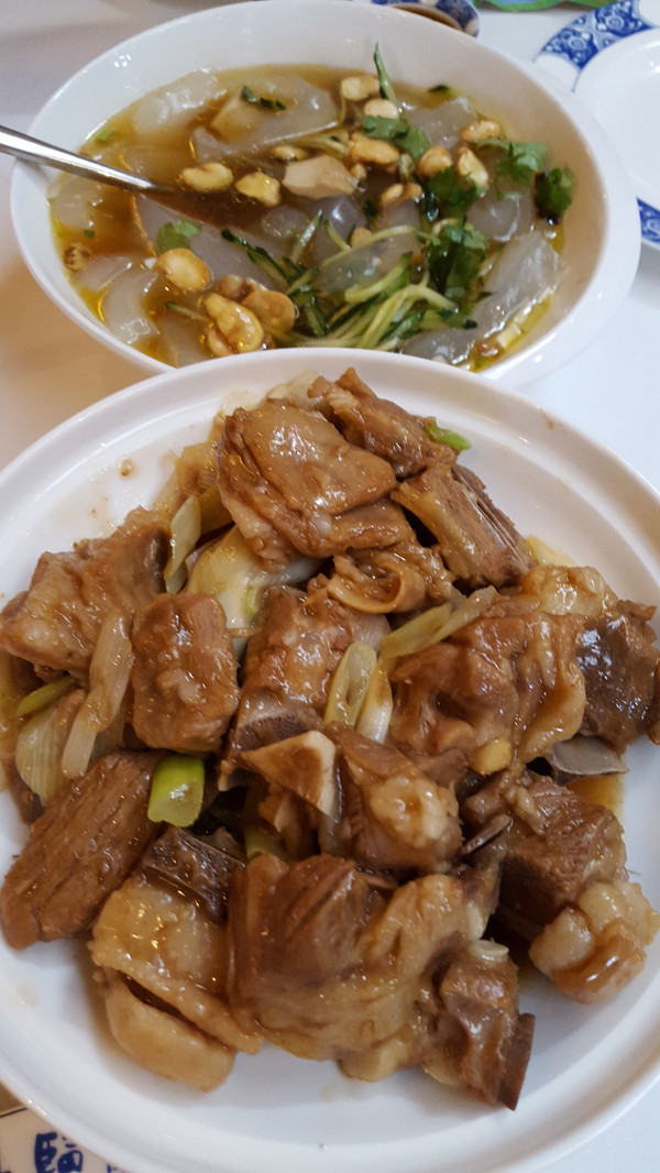 其他饭菜还算可口,唯独点了一盘特色菜,炖鸡肉(图中上方偏左,醋瓶左侧那盘),个人感觉比较坑,并不好吃。特别喜欢的是蛋汤,超好喝~另外我也是第一次(也是唯一一次)见识到了事先调好的刀削面。
