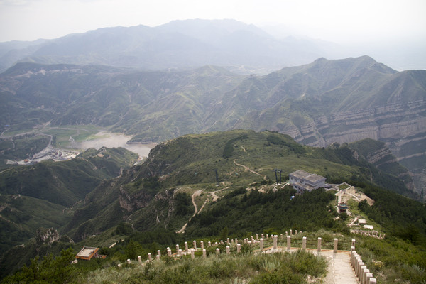从分岔口亭子绕过铁网往下走,半路还有个亭子。在这里可以看到索道上站和魁星阁,远处是恒山水库。