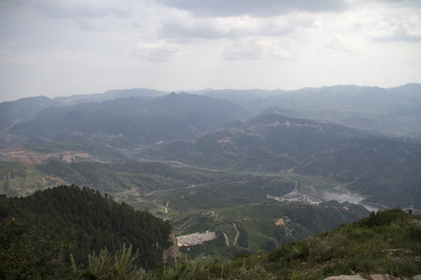 悬空寺上看恒山水库。右下为泄洪洞,远处为拱坝,拱坝右侧山上为溢洪道。