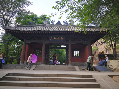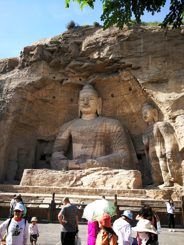 2个小时后,离开了悬空寺,向云岗石窟出发。中午12点终于赶到了云岗石窟。由于需要预约,下午两点才进入景区。来到石窟处第一山门,门前牌匾题写“入佛知见”四字,两侧对联“于智上求佛法,以悲下化众生”,似乎告诉碌碌凡尘可以进入此门上求佛法下化众生。