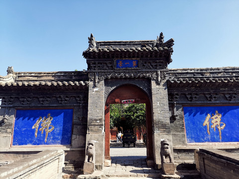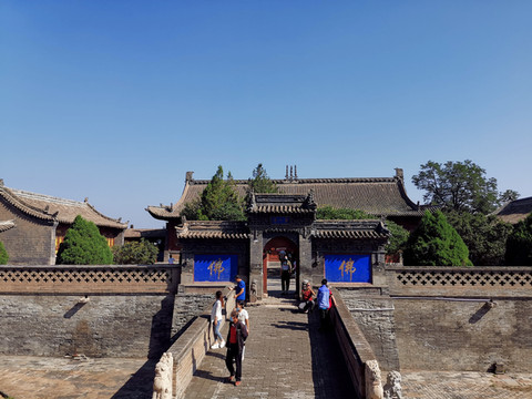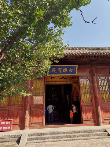 木塔前塔后殿,后面是大雄宝殿,寺院门上有“第一景”的匾额。