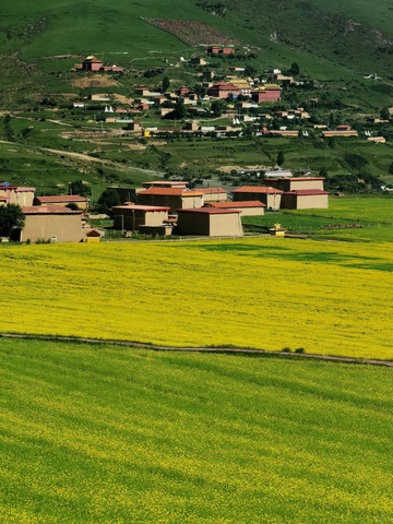 中午:阿坝县县边上麦昆乡大片的油菜花和草甸,与红色的藏式建筑相辉映,加之蓝天白云,构筑了一幅大开大合的田园风景画。