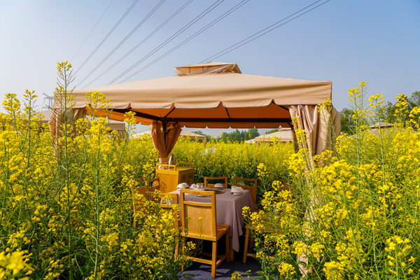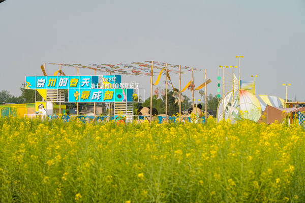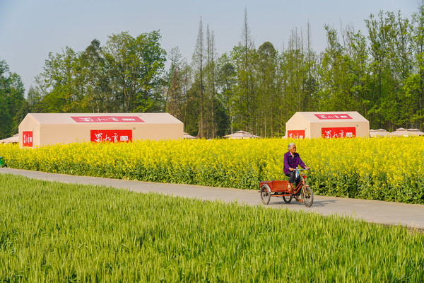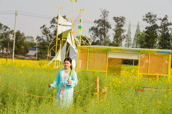 田园都市赏花节1号营地,这里是四川·崇州自驾赏花节的主要打卡地,超大面积的油菜花田中,还结合当地文化、融入了非遗元素和艺术主题,让油菜花田更加灵动起来