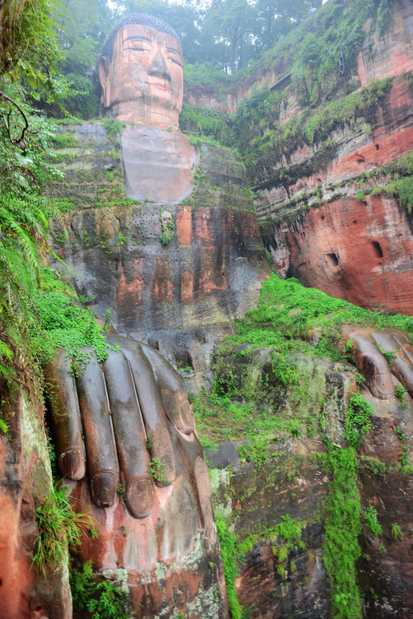 乐山大佛开凿于唐代,历时90年得以完工。大佛双手抚膝正襟危坐,造型庄严。佛头与山同高,足踏大江,体态匀称,神情肃穆。大佛通高71米,头部高14.7米,佛耳高7米,从膝盖到脚背高28米,脚背宽8.5米,脚面可围坐上百人。大佛头上共有螺髻1051个,为石块逐个镶嵌而成,做工细致,远看发髻与头部浑然一体。在大佛左右两侧沿江崖壁上,还有两尊身高10余米,手持戈戟、身着战袍的护法武士石刻,数百龛上千尊石刻造像,形成了庞大的佛教石刻艺术群。大佛左侧,沿“洞天”下去就是近代开凿的长近500米的凌云栈道,右侧是唐代开凿大佛时留下的施工和礼佛通道:九曲栈道。游乐山大佛有两种方式,一种是在乐山港乘坐游船或快艇从江上看大佛,船票70元,游览时间约30分钟,优点是能看大佛全貌和睡佛;二种方式是从岸上沿九曲栈道近距离接触观赏大佛,优点是可从不同高度、不同角度观赏大佛。前些年,游人发现:乐山大佛背后的乌尤山、凌云山、龟城山构成了一尊巨形睡佛。巨佛的头、身、足,分别由乌尤山、凌云山和龟城山三山组成。佛头由整个乌尤山构成,山上的石、翠竹、绿荫、山径、亭阁、寺庙,分别呈现为巨佛的发髻、睫毛鼻梁、双唇和下颚,山顶树冠各为“额、鼻、唇、颌”,栩栩如生。佛身由凌云山构成,山上九峰相连,犹如巨佛的胸、腰和腿;翘起的佛足是龟城山的一部分。整个睡佛体态逼真,堪称天造地设的奇迹。观看卧佛的最佳方式是乘坐游船观赏,可见到“(坐)佛在(睡)佛中”的神奇景象。