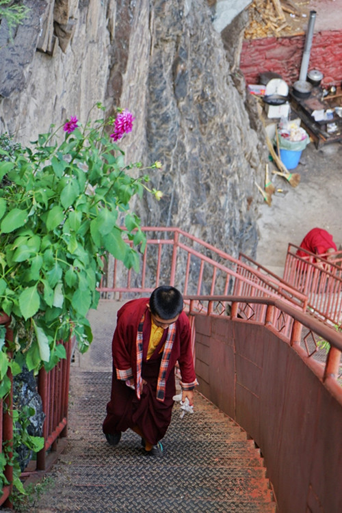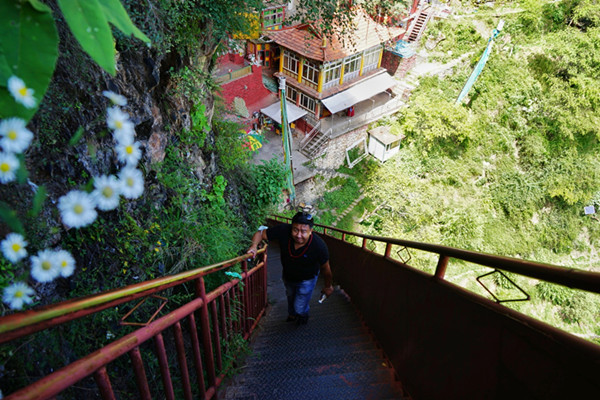 小心行驶了半小时车程到达半山腰,以为就要见到圣窟真容了,没想到还有一段倾斜高度近75度的悬崖天梯在等着我们,无论是前来朝拜的当地人还是上下搬运生活用品的僧人,都只能攀爬这段紧挨着崖壁修建的狭窄天梯,不过几百米的路程对于恐高的人来说是极大的挑战。
