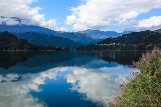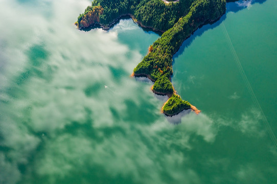 蓝天白云倒映在湖面上,仿佛天空之境一般。