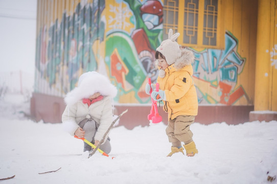 这里的雪也厚,孩子们就跑来这里堆雪人了。