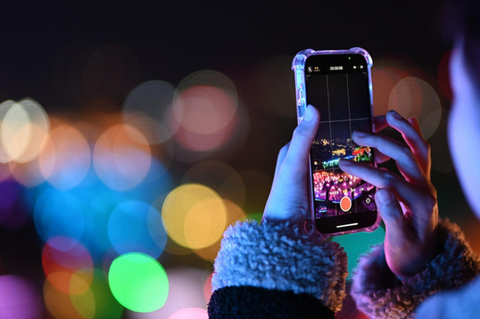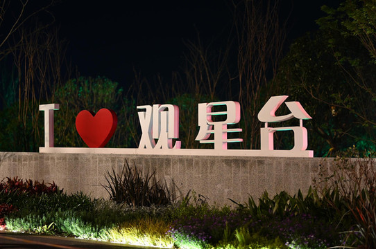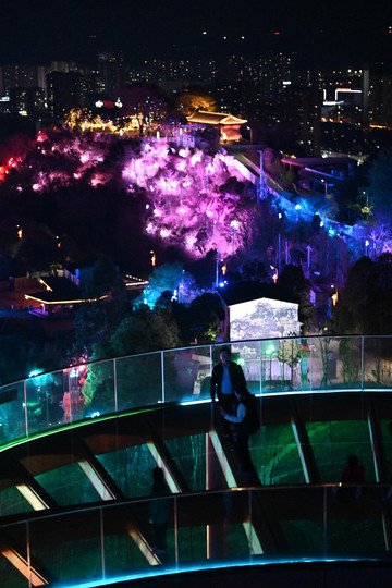 登上观星台玻璃栈道,在观景台眺望对面,五颜六色的灯光铺满山体,带给了我们强烈的视觉感官体验。