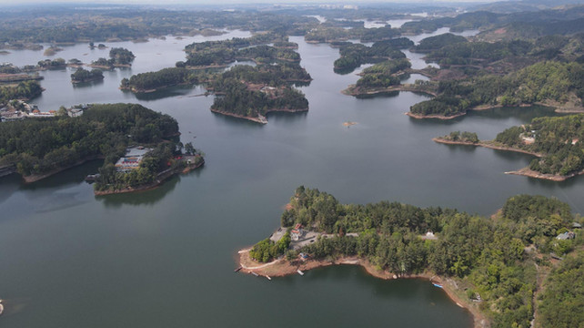 湖中的7峡7坝85座群岛星罗棋布,似水上盆景,碧波万顷,水天一色,回环掩映,如梦如幻。湖岸线长310公里,湖水面积23.6平方千米。