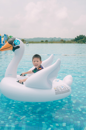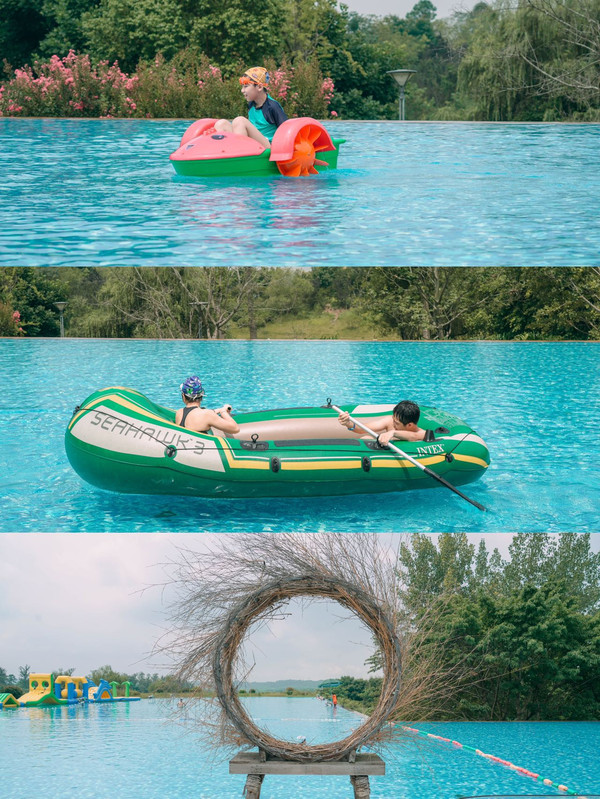 无边泳池真的太大了,确实是震撼到我了,没几个酒店能有这么大,泳池边际与无尽山水遥相辉映,碧波万顷,水天一色,鸟巢,泳池随便来一张照片都能够称霸朋友圈!还可以租各种造型的游泳圈,手摇船和香蕉船来拍照,非常出片。