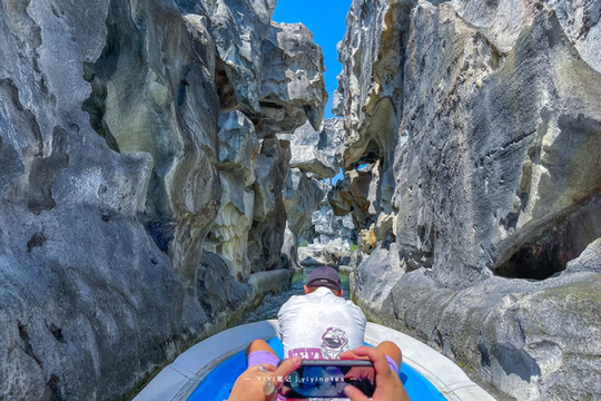\顺着这个水流往下漂足足漂了将近30分钟,沿途经过了黑漆漆的隧道里,什么都看不见,然后船一会高,一会儿低,速度一会快,一会慢,一边害怕,一边又觉得好刺激,不得不说,这个项目一定是个发泄情绪的好地方。