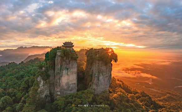 窦团山海拔1140米,森林遍布,空气非常清新,是绝佳的夏日避暑胜地,景区里还可以体验滑翔伞。山中除了大大小小的景点,还有着很多年历史的云岩寺和飞天藏,山顶的团山飞渡表演更是惊心动魄。