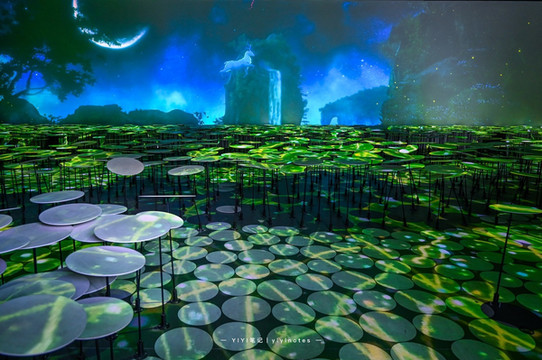 一片一片的青莲也象征了李白号青莲居士,灯光加上背景很有氛围感呢,灯影交错,星光闪烁,我们仿佛能看到李白那颗闪耀明星曾经辉煌。