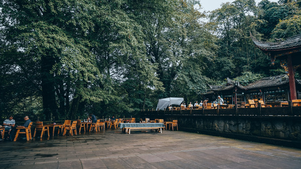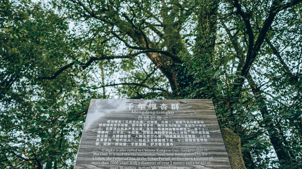 在蒙顶山,一定不能错过的还有一处千年银杏群,据说种植于西汉年代,如今已经有2200多岁了,树木直径达到了2米多,高达30多米,环绕天盖寺半圈,底下是喝茶的座椅,平时在这里喝茶聊天,非常舒服。