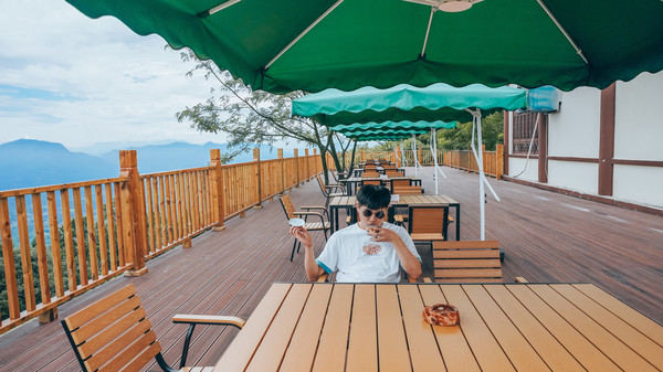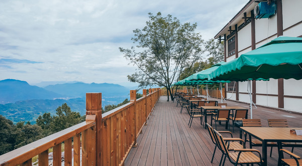 景区观景台的旁边,是一个休闲的茶座,在这里可以一边喝茶聊天,一边欣赏美景,如果天气好的话,在西侧还能看到傍晚的晚霞,把天空照射成通红一片,远离城市,没有一丝的嘈杂,有种归隐山林的静谧。