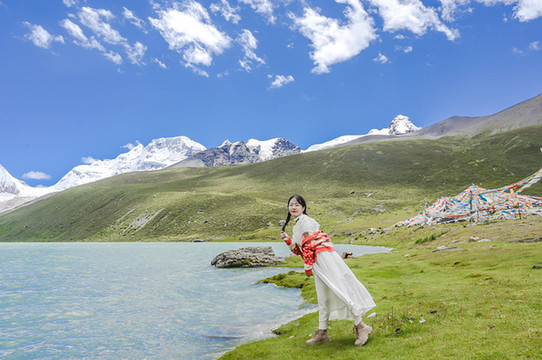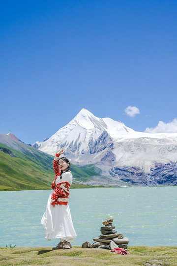 这里确实是冰雪的胜地,远看被冰雪覆盖的神山,加之毫不吝啬肆意游荡的云,入眼的每一处景致皆是大片。天湖相应,山湖相接,入眼的画面丰富非凡,却不让人感到拥挤,反而觉得宽广雄伟。此处圣洁,圣洁到恍如处在仙境,想象也不竟飞扬,会不会下一刻就有身穿白色华服带着王冠的神女从神山后露面呢?