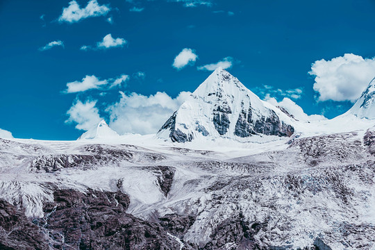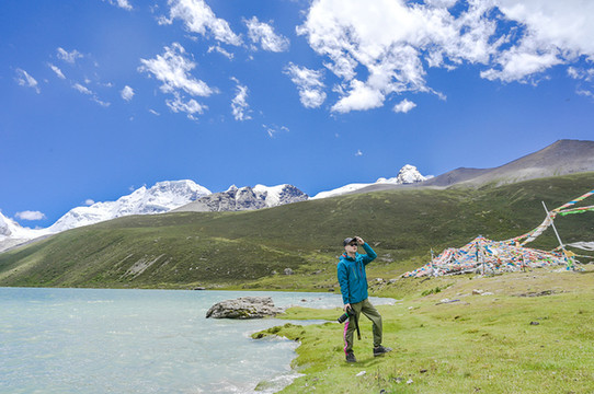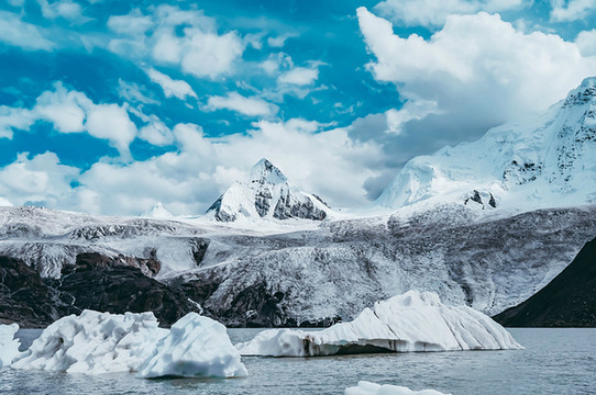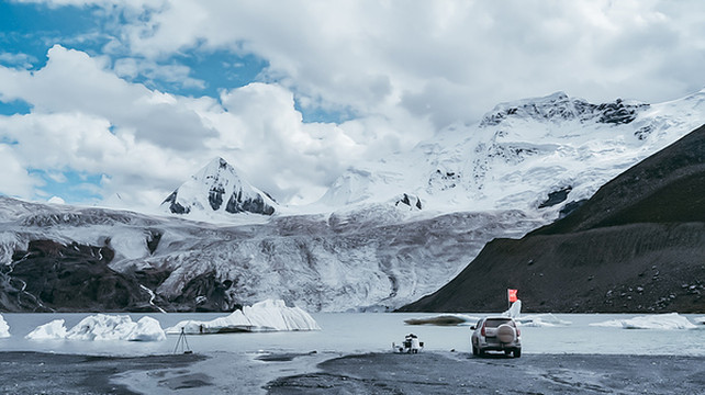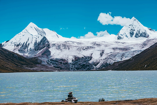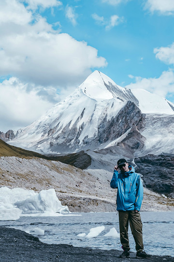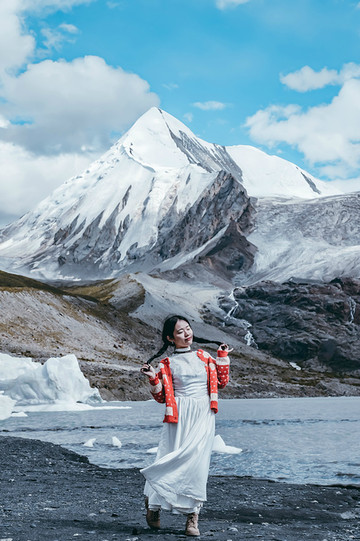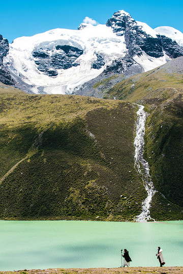 视线变得开阔,心灵也变得开阔,什么繁杂琐事在此刻都不值一提。这里的云很轻,夹杂在水天之间,而且水天又成一色,云也仿佛不在天边,而在我们身边。那载着白云的清澈的湖,时而被微风卷起阵阵涟漪,时而又安静的沉思,湖上漂浮着一块块冰雪,或大或小,都为这片湖泊添了几分宁静与安逸。行走在湖边,忽见两山之间倾泻出一条小型瀑布,也是神山的冰雪融化之圣水,它曲曲折折地从神山上流经各路风景,而后汇入湖泊里。