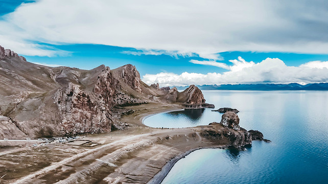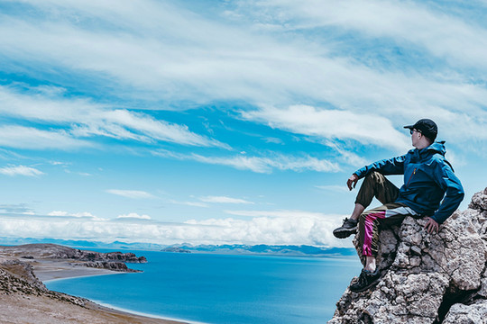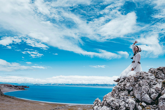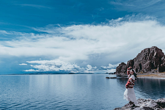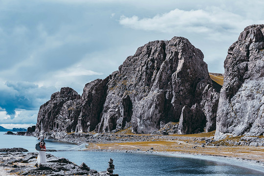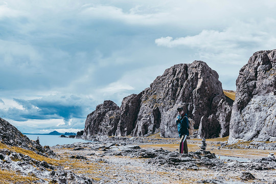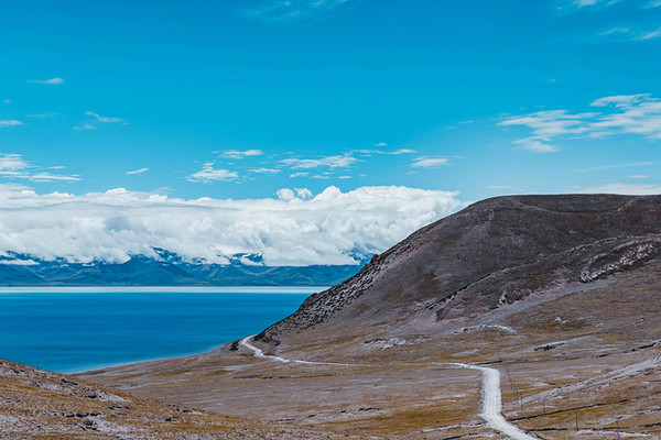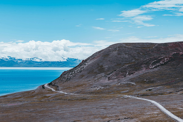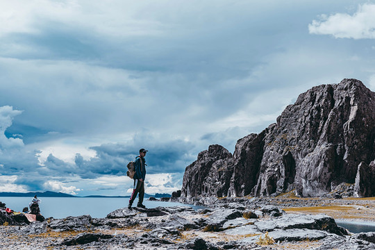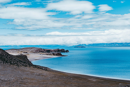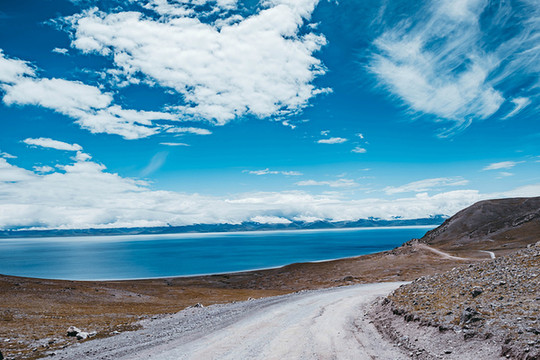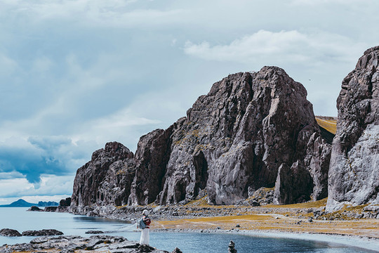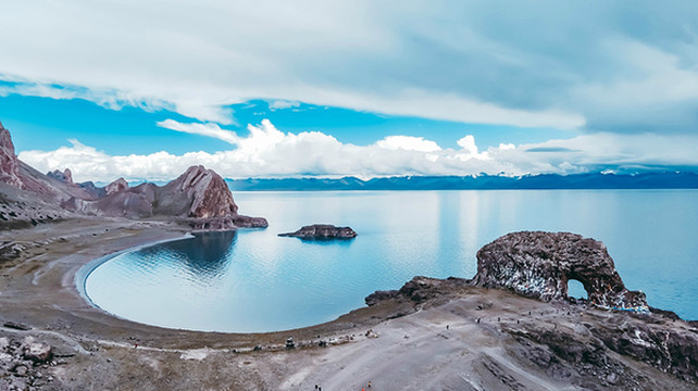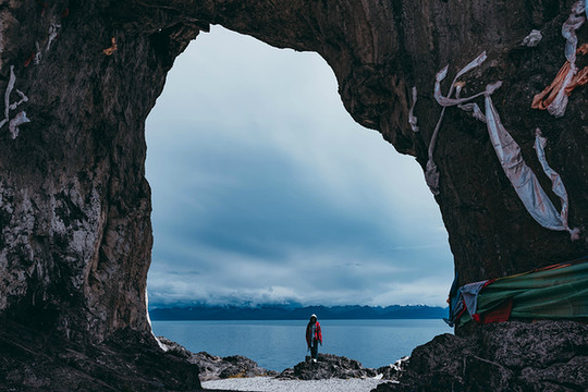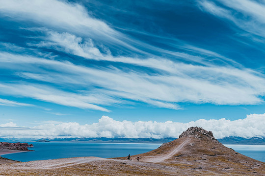 水天之间是高大的山,站在岸边,入眼的是岸边的近景,带着历史厚重感的圣象天门就在眼前。穿过圣象天门,视线豁然开朗,眼前的景物都变得清晰起来。纳木错北岸的高崖,是欣赏此处景色的绝佳观赏点,站在高崖上,由着湖面上的风带着湿气从身边流过,便产生飘飘临仙之感。放眼望去,蓝色的湖水与蓝色的天融为一体,宽广辽阔,仿佛见到大海。