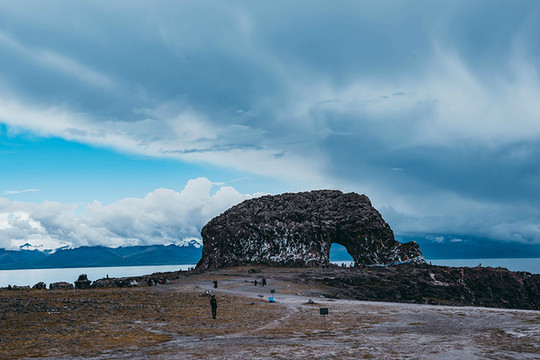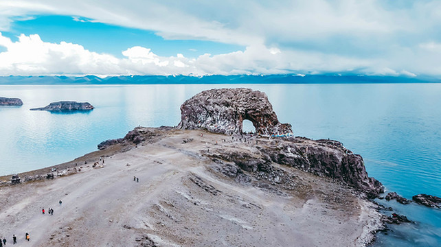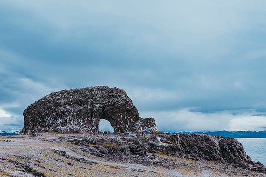 地图上的圣象天门,位于纳木错南岸的扎西岛,实际上它位于纳木错的北岸。严格来说,圣象天门并不属于纳木错景区,不过它却与纳木措有着千丝万缕的联系,这源于一个古老的传说,相传中公元八世纪,应藏王降服了念青唐拉后,把纳木措许配给了念青唐拉,之后二人结为夫妇。并在恰多朗卡岛举行了隆重的结婚典礼,婚礼前一晚,由108个神通修建石门。此石门形似一头圣象从东北走向西南,圣象的鼻子山入湖水中,仿佛正在汲取湖中的水喝,圣象的腹部有拱门。拱门外别有洞天,恍如仙境。圣象伫立在湖畔,仿佛是这里的守护神,因而人们称之为圣象天门。