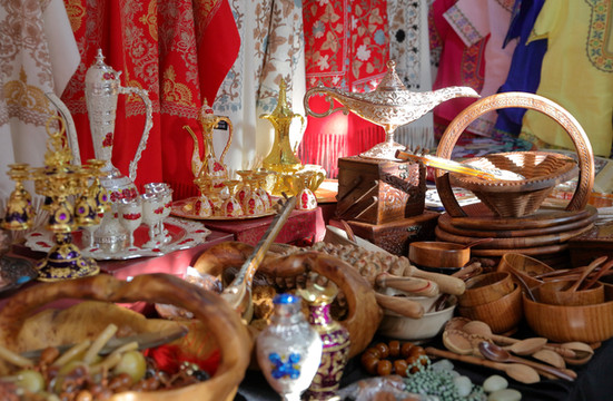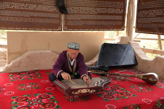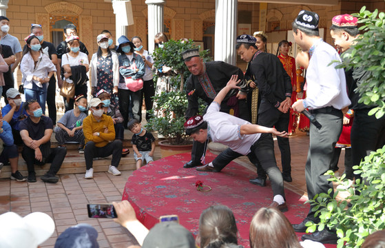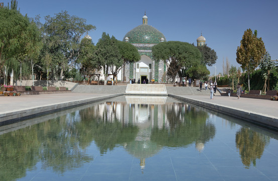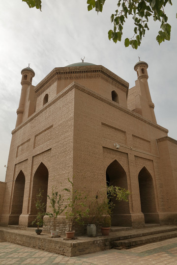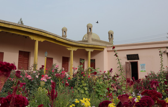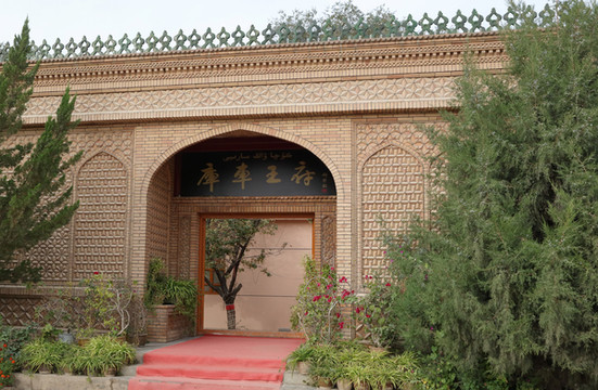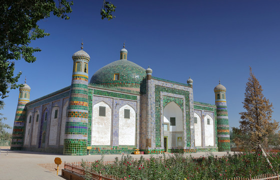 香妃墓无疑是到喀什的必游景点,现在已扩建成香妃园,面积很大,还有个挺大的停车场,门票120元,包括讲解。每位讲解员带十几二十人。线路是设定的,进门先看表演,由三位演员扮演香妃的三个身份:姑娘、妃子、女将军,还有一位演乾隆的,以歌舞为主,演出大约半小时,不知一天有几场。然后到一个院子里,像个四合院,四面房间内展示着维族人居家生活场景及生产生活用品等。这是讲解员发挥作用的所在。院子中间有个亭子,正房前面有个宽大的走廊,这里是表演婚礼的地方。同样是从观众中选新郎,这个新郎比较活泼,互动得不错。这是我看过的最热闹、内容最丰富的婚礼表演。之后就到主体墓室了。其实它是香妃家族墓,始建于1640年,葬了五代72个家族成员。讲解员说香妃是他家的最后一位成员,她没有后代,其他族人也没有后代。墓室内有几十个坟丘,大的是男人的,小的是女人的,特别小的是小孩的,还有两人合葬的。维族的习俗是姑娘出嫁后去世要回娘家入葬,所以香妃死后花了三年时间被送回老家。而根据严肃的史实,香妃即容妃,很得乾隆宠爱,55岁病死宫中,葬于清东陵。墓室前修了一个巨大的水池,得以拍摄香妃墓及其倒影,只是墓前的树有些遮挡。从这里往左有个绿树成荫的院落,里面有两个不大的清真寺及讲经堂,都没有开放。讲经堂内有一块椭圆形的“圣石”,能祛病驱邪。两个清真寺都很讲究,雕花彩绘木柱很精美,漆面已经严重剥蚀。