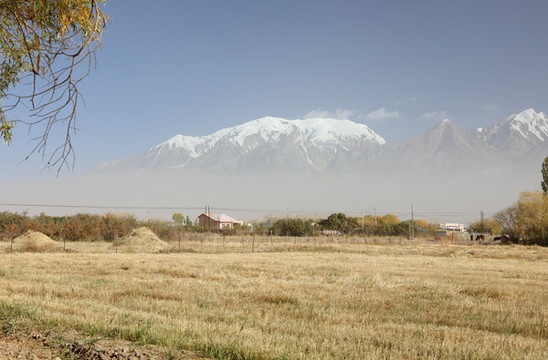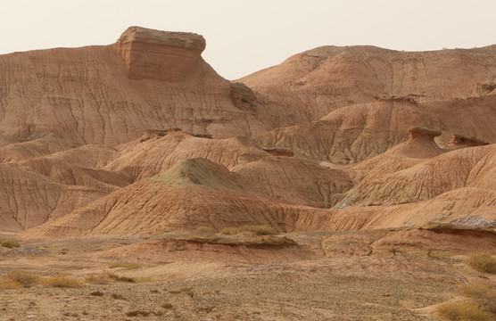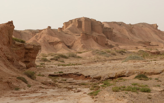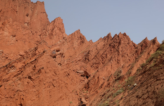 北京、库尔勒、喀什纬度相当,都在北纬40度上下,沿土和高速从库尔勒到喀什一直向西大约1100公里,左侧隔着国道和铁路线是一片荒漠,右侧是天山余脉。山上几乎寸草不生,在沙尘中越发灰黄,偶有红色山体打破单调。其实单调的颜色并不能掩盖山形的千姿百态,有丑陋的、有奇怪的、有狰狞的、有可笑的,唯独没有美的。这就是所谓的南疆缺少美景的现实吧。
