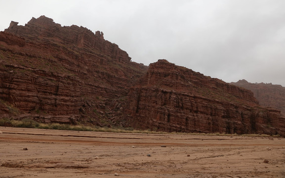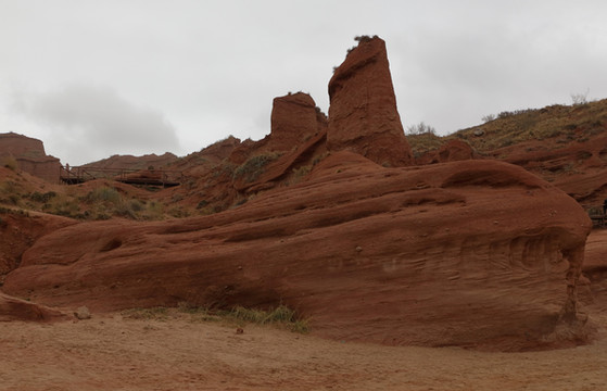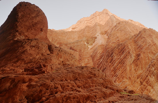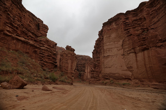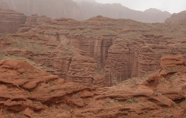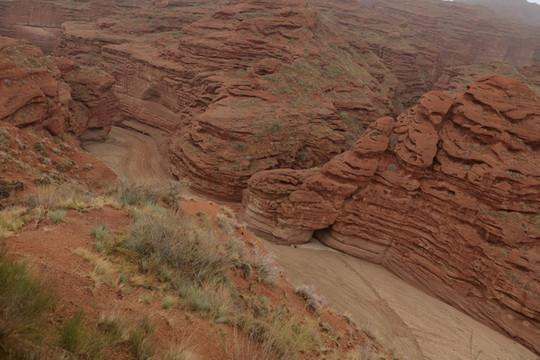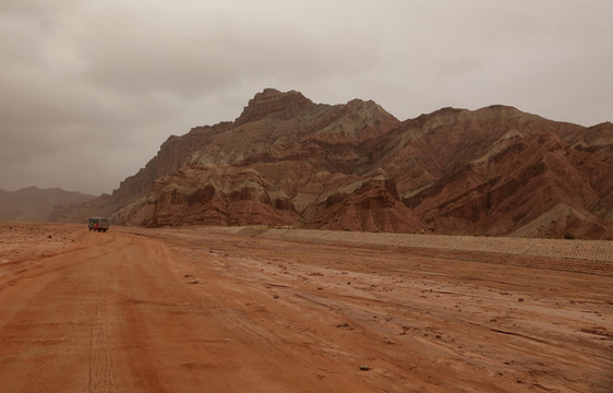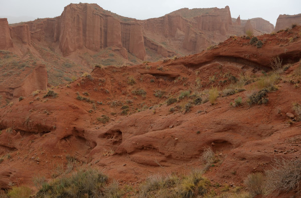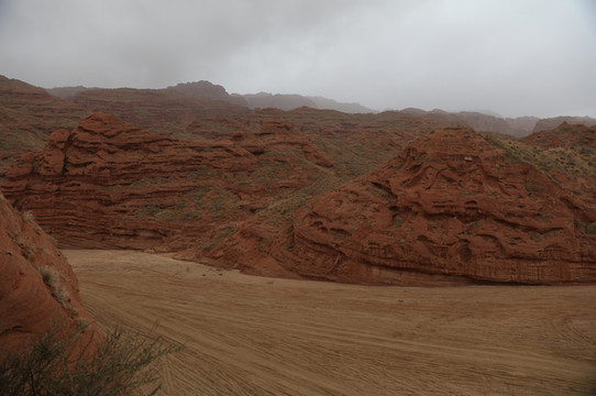 温宿大峡谷风格完全不同。它成形于两百多万年前,经过多年的风蚀、冲刷成为现在的样貌,也是红色,这里开阔得多,应该是条大河。两侧的山更有棱角,有的像一整面墙,有的像一群城堡,有的像大粪堆,而倾斜的平行线条仿佛在诉说着它的经历。当地人称之为“库都鲁克大峡谷”,维吾尔语意为“惊险,神秘”。 这里有中国罕见的远古岩盐地质绝景、奇特的雅丹地质怪景、中国仅有的巨型岩溶蚀地质秘境。自驾或乘景区的四驱车进入,不是四驱车好像不让进,四人门票加自驾车收费一共244元。要签个协议,允许救援。峡谷里本没有路,走的车多了也便成了路。可惜这路坑洼不平,松软泥泞,最好轧着之前的车辙印走,免得陷进去真要叫救援。主道两边有几处分岔,其中四个分岔可以进入,没有导航,没有路标,游客中心会给张地图。同样景区在建设中:修一条将两个观景点连起来的栈道。我们遇到工程队的车,开车的是个工头,热情地给我们带路,他说这里有时还会发洪水,所以不能修路。我们沿着已经修好的部分栈道上到一个山顶,视野开阔,正好能看到一个转弯,两边山体被水切割的印迹清晰可见。天很冷,下着小雨,我们更多地是躲在车里打开车窗看景。