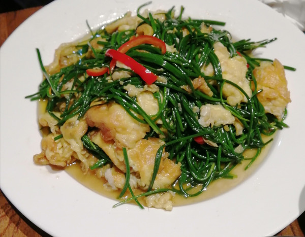 库车另一家被称道的餐厅是亚克西姆。这家店在点评上评价挺高,打车时当地司机也说它好,所以决定去尝尝。门脸很小,进门直接上二楼,店面很大,整体绿色装修,穆斯林风格浓郁。我们点了一桌素菜,西红柿辣子鸡蛋挺新奇,我们保守地要求去掉辣椒,豆角辣子烧茄子偏咸很入味,这两道菜油比较大。木耳山药和恰玛菇比较清爽,第一次听说恰玛菇,吃起来有点像白萝卜。酸奶细腻微甜,很赞。晚上客人多,上菜不太快。服务员很勤快,但有时语言有点障碍。很喜欢它家的筷子,筷子杆是反复使用的,筷子头是一次性的,卫生和环保兼顾,又比一次性筷子好用。但会增加洗碗的麻烦,这可能也是大部分饭店不用的原因。