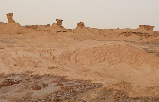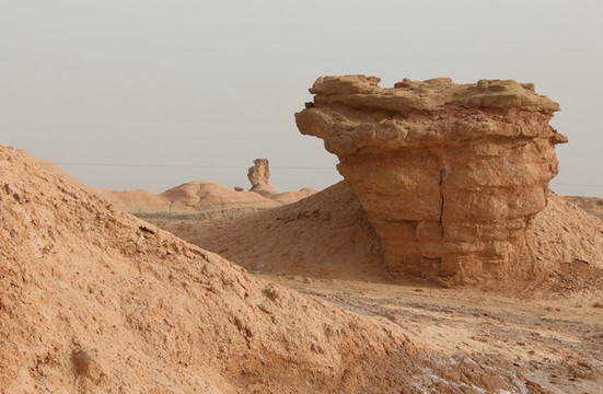 离石窟不远有个所谓的魔鬼城,是个野景。这里地处少雨多风的干旱区,地形由剥蚀、风蚀和流水作用形成的纵横沟谷及沟谷间的梁脊、台地、孤丘等组成。无人且免费,很适合拍照,只是有点难找。路边有网拦着,在石油开采区的入口处有个缺口可以进入。形态各异的岩石看起来像土堆,好像一碰就会塌掉,但摸着还是很结实的。