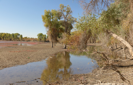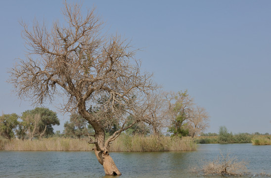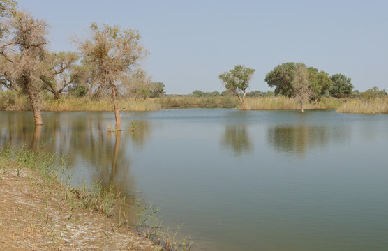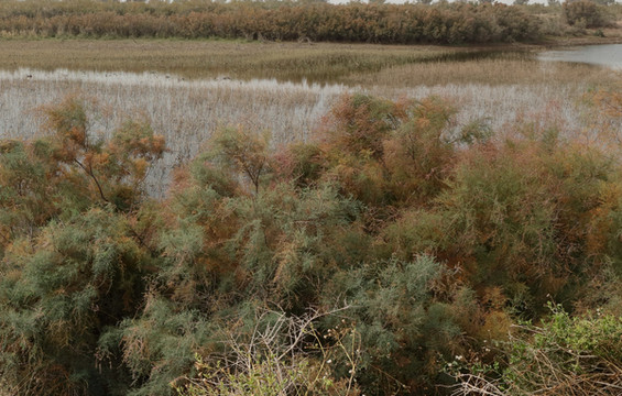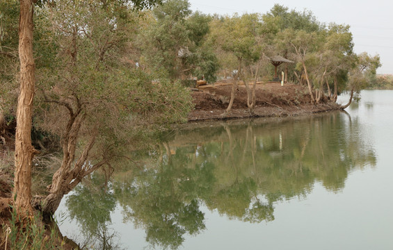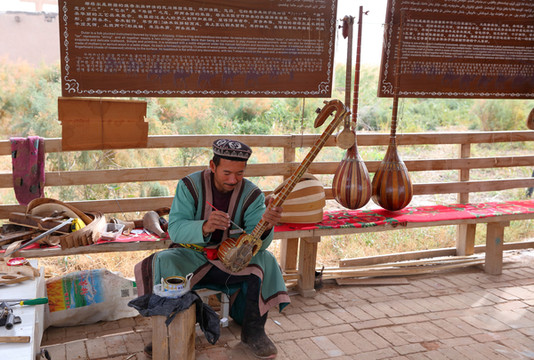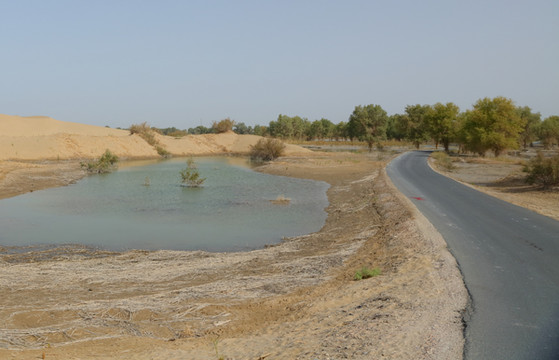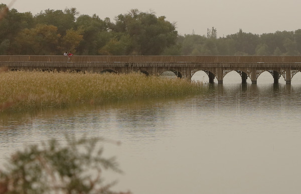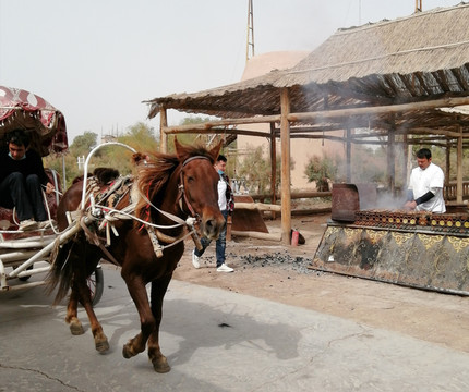 巴楚位于喀什和阿克苏中间,几片林区加起来据说是世界上最大的原始胡杨林,面积316万亩。近几年开发成红海胡杨林国家森林公园,增建了很多表演、娱乐设施,门票40元。在游客中心买了票,开车沿着狭窄的村庄小道走一段路,就进入了风景区,一大片水域边都是胡杨。我们把车靠边停下,走走拍拍。开车再走一段就到了景区大门,这里也售门票。进门是个仿真村落,有做琴、弹奏、织地毯等表演。从这里可以乘电瓶车、马车或租自行车深入景区,我们选了电瓶车,每人30元,中间停几站,任意上下,但是买了什么车的票就只能乘这一种车。第一站是个石刻展,大概是模仿史前文化的洞窟石刻和壁画,很粗糙,光线昏暗,没有介绍,不知所云,没什么意思。门前还摆了许多假胡杨,真不明白有那么多真的,何必搞些假的?这个景点太没价值。下一站是歌舞表演,我们到时只看了个尾巴,但看那些演员的形象和水平,没什么遗憾。再一站比较长,路不平还过了个桥,风景不错,然后到了吃饭休息的地方。这里有“丝路第一馕坑”,一次能烤几只骆驼几匹马多少只羊的我也记不住了,有冲动爬上去看看,当然不允许。旁边烤羊肉串的烟笼罩了方圆十几平米,我们要了两串,趁没烤好的功夫在周边转转。湖边有个餐厅,有点大食堂的感觉,但凉亭样的环境挺舒服,简单地吃了一餐。
