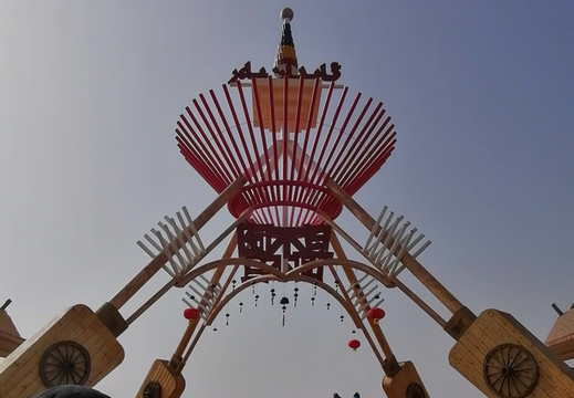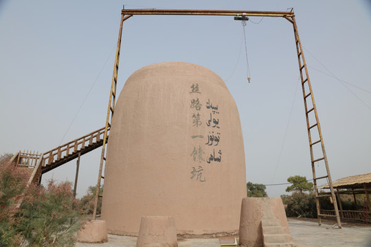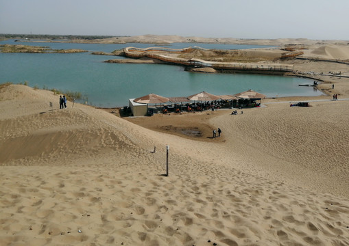 罗布人村寨是西部面积最大村庄之一,包括塔克拉玛干沙漠、游移湖泊、塔里木河、原始胡杨林等。从很远的地方就被游客中心拦住了去路,花50元买票乘景区车进入。这段路大概三四公里,车开到一个大门楼前停下,进入这个阿不旦大门就算进景区了。检票换另一种景区车继续深入。一路有胡杨林、小水塘和沙丘,黝黑的柏油路上上下下弯弯曲曲穿行其中,坐在最后一排的倒座很适合拍照。第一站是神女湖,下车处有个大棚可坐下来吃喝休息,旁边有沙山和一汪清水,修了沿湖栈道。景色不错。爬上沙山俯瞰更辽阔。还有骑骆驼、开坦克、小朋友玩的挖掘机等,另一边是冲沙项目,一人150元,自己驾车是一车380,可坐四人。讨价还价到他驾车,我们三人乘坐380元。开车的都是当地维吾尔村民,汉语有限。给我们开车的胖小伙儿飚起车来很嗨,引得车上人直喊“慢点儿”。车开到一处地点停下来让我们玩,可以试着开开车,也可以滑沙,当然我们主要是拍照。然后返回。我看着周围的沙山长得都一样,根本搞不清哪儿是哪儿,很佩服当地人不迷路。从这个景点接着坐车到村寨,从这里就可以走到阿不旦大门了。下车处是个大棚,可以吃饭,包子烤串手抓饭之类的简餐,环境很原始,这种设计既便宜又有味道,意外的是竟然有洗手池。这边有一大片水面,水边水中都有胡杨,草房、草棚沿水边排开供人休息,景色更柔美,很宜居的样子。但这里并没有人居住,不知罗布人都住在哪里。一大片工地显示正在大兴土木,在建的客栈保持原罗布人民居特色,草木的外形加上有卫生间的现代功能内核,还规划了演出场所,建好后还会有生活场景、民俗表演吧?这和仿古一条街类似,刻意的特色还有味儿吗?一个高台上立个粗壮的胡杨树化石,介绍上写着它形成于侏罗纪时期,是树根被二氧化硅替代的产物。旁边的太阳墓很容易被忽略,一片泥地上有一堆矮木桩,组成环状,周围的摆成放射状,象征太阳及其光芒,它们是男子的墓地,有近四千年的历史。罗布人村寨前几年由私人开发,经营得不错。现在政府接管了,加大了开发力度,要建成5A景区。到处是建筑工人,只看到一位老大爷像是本地人,穿着民族服装、长须飘飘地从土路上走过。