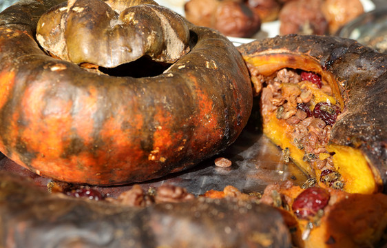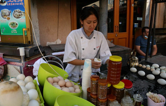 喀什夜市除了烤肉、包子、馕,还有烤南瓜、烤鹅蛋、酸奶粽子、缸子肉等,地方特色比较明显,质量参差不齐。烤南瓜里面放了各种果脯干果,一条街上好多家,看着蜜蜂在敞口的南瓜上忙个不停,心里有点儿别扭。选了一家把南瓜放玻璃柜里的,喜欢这道甜蜜的小吃。不去和田,只能在喀什体验烤鹅蛋了。卖蛋姑娘很认真地敲开蛋,放了两三种调料,再放上一个极小的塑料勺。勺太软,蛋太硬,杵半天掉一小块,咬着像皮筋一样有弹性,而且吃完上面一层就完全没有调料了。15块钱一个,没舍得扔,我和老公两人站在街上费力地狼狈地吃完了这个蛋。特别说明一下,我们是下午买的,当地人分析这应该是前一天晚上烤的没卖完。有一天上午走热了,在夜市开张不多的几家摊上买了个西瓜,小贩洗也没洗,切了很豪爽的几大块,我们很享受地吃了,西瓜真的好吃,就是脸有点脏。酸奶粽子真是名符其实,把一个粽子放酸奶里,毫无技术含量,我也会做。