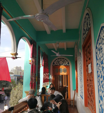 喀什百年老茶铺名头叫得响,当地人并不太推荐,我们进去看了一下,二楼一个大开间,几个“炕”上都坐满了人,脱鞋上炕风格,当地人居多,我是不太适应。一屋子人都在说话,很嘈杂。外面走廊有几张小桌也都坐满了。我们去了相隔不远的另一家茶馆,有桌椅板凳的,当地人一定让我们尝尝特色新疆茶,一种用十几种植物冲泡的茶,放的什么不知道,只知道里面没有茶叶。味道自然很复杂,比较浓稠,加上蜂蜜更好喝。茶馆提供干果和一种自制甜点,干果放在饼干上包上一层糖,好吃就是太甜。每家茶馆都有音乐演奏,有的还边弹边唱。