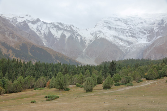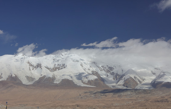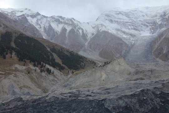 奥依塔克冰川公园位于阿克陶县奥依塔格镇,从喀什沿314国道南行86公里,看到标识后还要往里走30公里乡间小路。我们去的这天天色昏暗,一路沙尘。12点多到公园大门停下车,穿上薄棉衣,买门票和景区车票共花了53元。景区车开了10多分钟把我们卸下,剩下的路要步行或骑马。其实再向前直到栈道都有柏油路,管理员也是开车巡视,景区车留一段路可能是给当地人留点挣钱的余地。骑马上行下行都是50元,步行大约十几二十分钟,走起来有些气短,毕竟将近3000的海拔。我们是第一批游客,马排成一排等待挑选。我看中了一匹漂亮的高头大马让老公骑,我自己打算徒步的。不想他在两个半人的帮助下上了马,说太高坐不稳,不得已又下来换了匹矮个儿的,依然害怕得浑身发紧。马很快驮着他跑没影儿了,我慢慢喘着粗气往上爬,爬到栈道前他已经下了马,我让他等我从平台下来给他拍骑马照。牵马人等不及了,大批游客到了,他要带着马去接别的客人。我们一起边往下走边拍照,一辆管理员的车停下来,招呼老公上车,肯定是看他走路费劲,决定捎他一程。有福之人不用忙。门票上印的是克州冰川公园,这应该是它的正式名称,但大家通常叫它奥依塔克冰川公园。看园内的介绍这座大雪山叫阿依拉尼什雪山,高6684米,每年5-9月经常发生雪崩,是座无人攀登的处女峰。冰川叫其克拉孜冰川,是低纬度低海拔冰川,海拔2804米。这四个名字让我摸不着头脑,它们怎么来的?有什么含意?有什么关系?不管怎么说雪山还是蛮壮观的,冰川也很有特点,下半部分是黑色,还有森林、高原草甸和羊群,遇上蓝天白云应该是一幅很美的画卷。