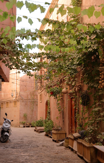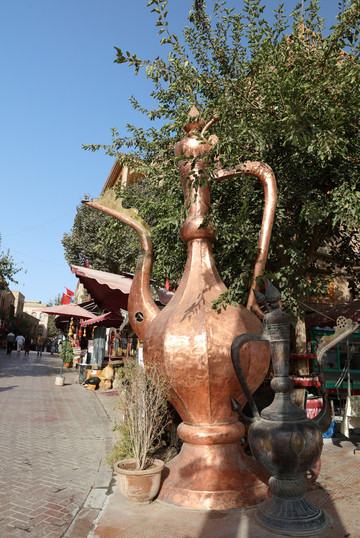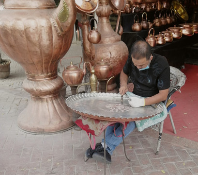 在喀什最不适应的是早上八点多天才亮,八点半吃早餐。对于我这个每天六点以前就醒的人来说,这一早上好难熬。喀什在老城保护上做得相当不错。房屋和街道基本维持原貌,又加以修整,大部分居民依然住在老城里,商铺、夜市也多是由本地居民经营。还保留了学校、医院。当然,民宿街和油画街似乎是外来人的天下。家家都摆放着花草,门前、阳台装扮得生机勃勃。街面很干净,洒水车频繁出没。经常看到环卫工人和商户在打扫,喀什每天早上扫街是一景,每家人都在洒扫门前街道。几乎每条街都有卫生间,也比较干净。在艺人街上看到一位店主不慌不忙地錾刻一个巨大的铜盘子,认真又悠闲,旁边摆着他做的各种漂亮的锅和壶。他说做这个盘子需要一个月。
