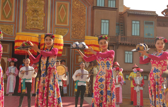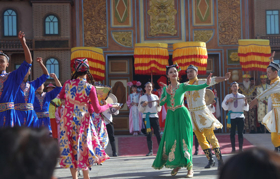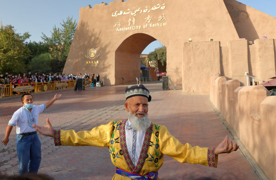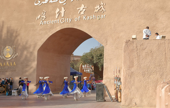 喀什是中国最有异域风情的地方,我们在此住了五晚。十一前到喀什,游客还没批量抵达,但节日气氛已随处可见,国旗插遍每个大门。第二天十点赶到东门看开城仪式,人已经围了好几层,我们只好插空站在后面。一位老者穿着民族服装一边跳舞热场,一边邀请游客,很快几位游客入场一起跳起来。十点半仪式开始,姑娘小伙陆续走出城门,伴着录音跳舞,半个小时热热闹闹地过去了,没有什么出彩的地方。