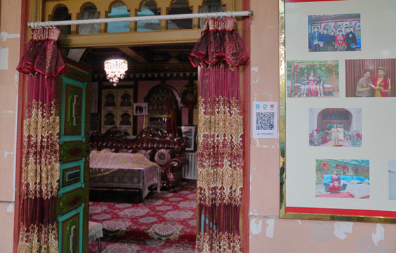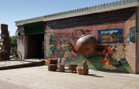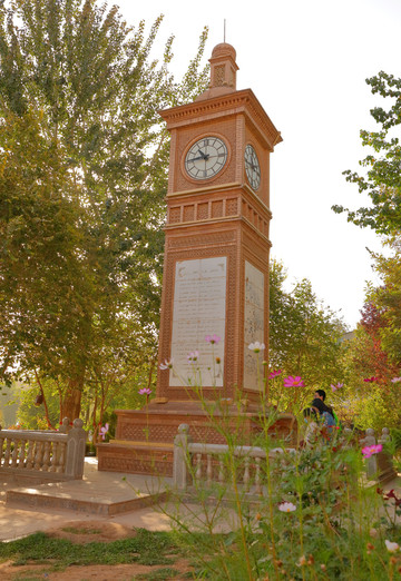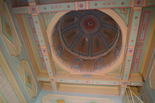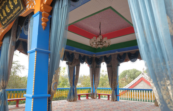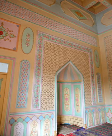 库车王府从1759年起就是当地的维吾尔亲王库车王居住的地方。如今的王府是在原址基础上按照末代库车王达吾提·买合苏提的回忆复原的。库车王府面积很大,纵横都有两三百米左右,建筑多为维吾尔风格,内部色彩鲜艳,院子里有花园、绿地,环境相当不错,还有个内饰很漂亮的清真寺。我见过的清真寺里面都是光秃秃的,这个小清真寺四面墙壁及穹顶画着各种鲜艳的图案,很不寻常。参观分为龟兹文化展览区、王府参观区和老城墙三处。展览分好几个展室,用图片和实物介绍龟兹的历史文化。这里最早是阿育王的势力范围,后被匈奴统治,公元前70年归属西汉,之后在汉与周边各国之间摇摆。当时地域广阔,是西方大国。龟兹是我国境内最早传入佛教的地方,公元前二百年阿育王时期就有了佛教,公元三世纪最为盛行,龟兹僧人为佛教在中原弘扬起了很大作用。回鹘得势后强行改信伊斯兰教。库车北面的克孜尔千佛洞即是我国最古老石窟之一。石窟中的一些壁画和浮雕复制品也被放在这里展出,当然选出的是精品,非常精美,仙气与俗艳并存。最大的区域为王府区,这里复原了王府一家的生活场景,居中的办公会客室是中式建筑,里面展出了历代库车王画像及介绍,末代王在解放后为促进民族团结做了不少贡献,政府对他的评价及给予他的待遇也很高。他于2014年以八十多岁高龄去世,陵墓就在院子后面,挺大一座建筑专为他修建。院中央一个非常突出的建筑是观景台,身处高处景色好又凉爽。后院是生活区,房门大开,我正要走进去,看到里面一位丰满的保养极好的中年妇女端坐在沙发上,我一脚门内一脚门外地站在门口,怯怯地问“这里有王妃吗?”她优雅地笑答“是的。”我意识到她就是王妃,惊讶地说“这么年轻呀!”我们去得早,没什么游客,我本想进去和她聊聊,但老公不乐意。我退出来才发现旁边的牌子,写着合影30元,有付费的微信二维码,墙上还有她与一些名人的合影。这就是王妃的工作?后来我才知道王妃比库车王小好多,现在应该不到60岁。后面有一段清朝的城墙,在王府前面的大街上也有好长一段城墙。最有趣的一个处所叫轻松府,占据了院子一侧,漂亮的拱门与整个院子很和谐,其实是厕所。不知这名字谁起的。