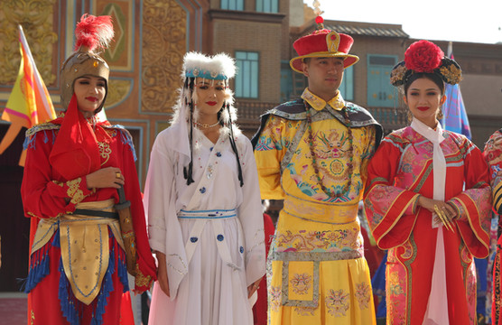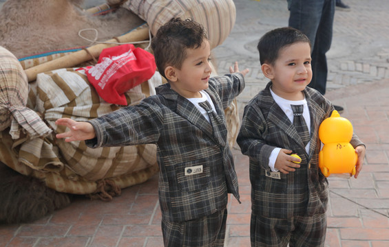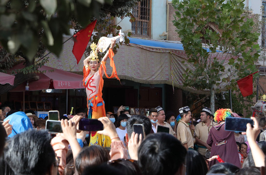 十月二日我们傍晚进城,正赶上迎亲表演。一队高大的骆驼载着衣着鲜艳的姑娘招摇过市,牵骆驼的男生也威武帅气。到老茶铺路口小广场骆驼跪下让美女下来,广场上早已备好两个鼓形高台,两个姑娘站上高台跳起舞。然后男主持人把“西域公主”和陪她的“家人”请上茶铺二楼小平台,再从游客中选个新郎,举办婚礼。这和全国各地的套路一样。我被一旁的一对小兄弟吸引了,妈妈要给他们和骆驼合影,一个小男孩特别乖地配合,另一个满腹委曲怎么努力也笑不出来,妈妈跑来跑去给他们摆姿势,我在一边捡了个乐儿。婚礼结束,骆驼载着姑娘们款款离开。