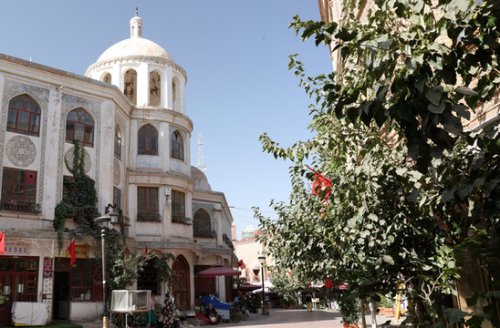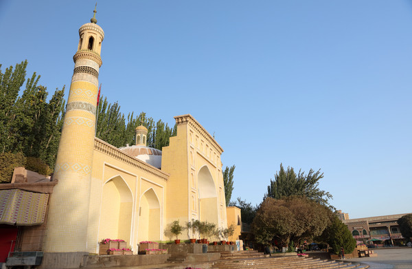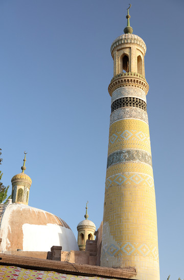 艾提尕尔清真寺不愧是新疆第一大寺,占地1.68万平米,前面的广场也有上万平米。淡黄色的门楼和宣礼塔在扇形的高台上,不十分高大,但很庄重圣洁,里面一个很大的院子,绿树成荫,沿通道走到正殿,长方形的正殿除了两排立柱空荡荡的,一侧墙上有一幅巨大的手工挂毯,石榴图案来自于“各族人民要像石榴籽一样紧紧抱在一起”这句话,这句话出现在新疆好多地方。清真寺内没什么可看的,45元的票价有点亏。