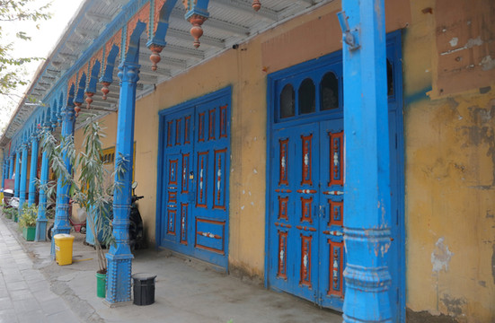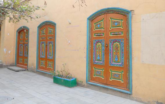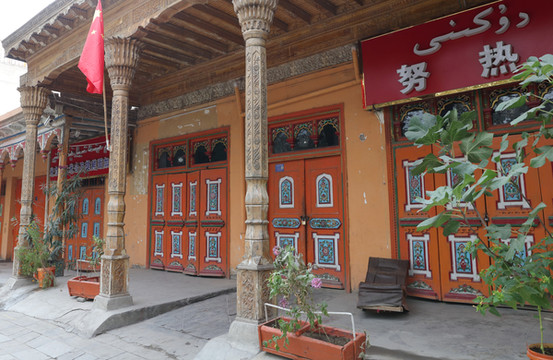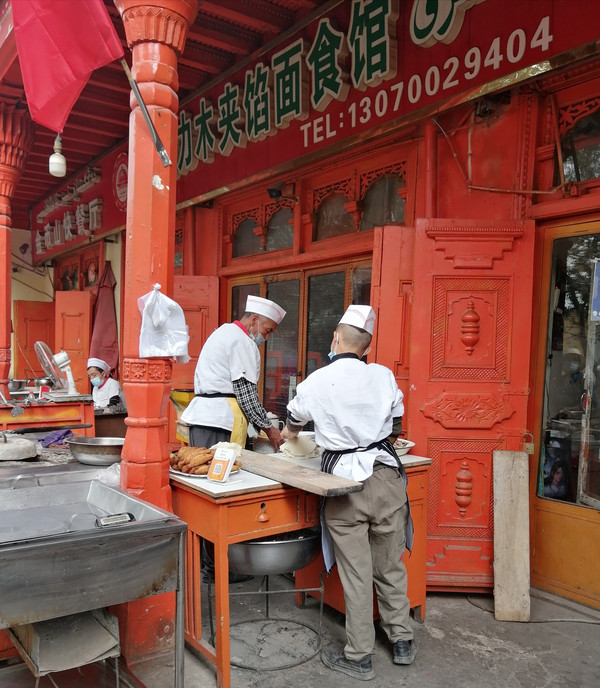 热斯坦街不长,有住户也有商铺,门窗五颜六色,各种花纹雕刻,极具南疆特色。不知是时间早,还是受疫情影响,门都关闭着,有的上着锁。除了几个拍照的游客见不到人。只有些卖大馕的店和那家网红阿力木夹馅面食馆开张了。