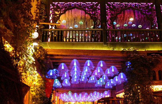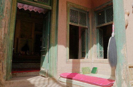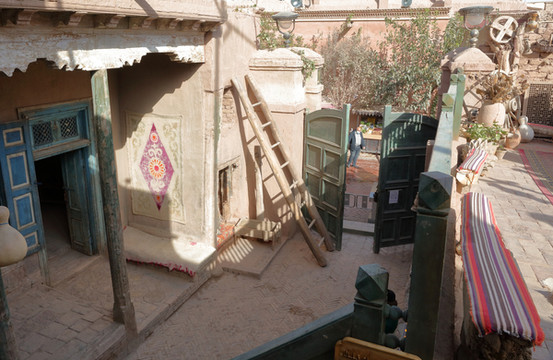 进城后我们先去巴依老爷家参观,上午老城开门的店铺不多,游客都来老爷家串门了。不白串,要交40元,门票含讲解,每个讲解员带七八位游客。老爷家分前后两个小院,格局是个“日”字型,上面一横是后院墙,下面一横是大门,其它笔划是二层小楼。老爷住在中间一横的楼上,前后院尽收眼底。管家住老爷楼下,前后院穿梭自如。前院左边是厨房,厨房上面是露台,讲解员说老爷时常坐在露台上偷听街上人聊天,看谁说他的坏话。印象最深的是地下室,墙砖无论制作还是施工都是高水准,一百多年仍然丝毫不走样。木质门窗有些变形,但当年的精雕细刻清晰可见。