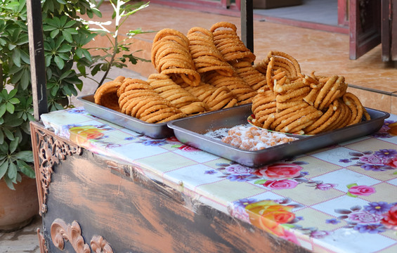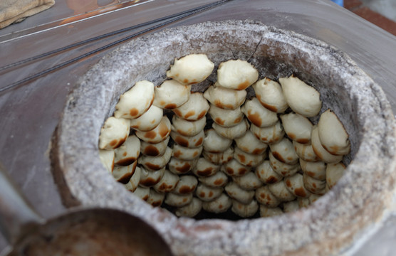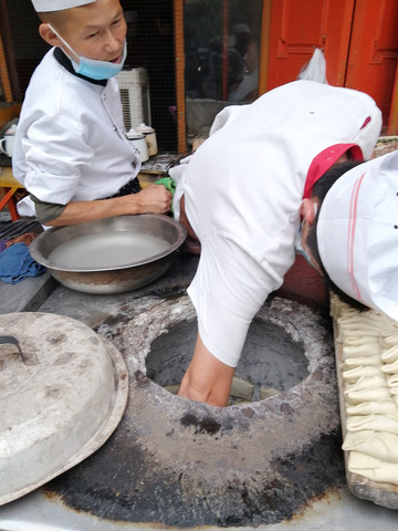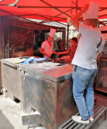 库车老城里的烤包子和大馕名声在外。我们逛完库车王府,又逛完热斯坦街,又逛完库车大寺,阿力木夹馅面食馆的第一炉包子刚烤好。尝了尝没觉得特别好,就是肉比较肥,油大。馕实在太大了,没有机会吃它。