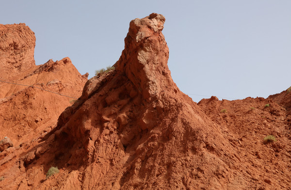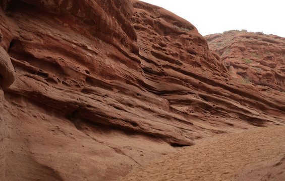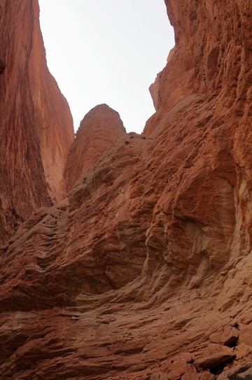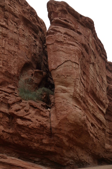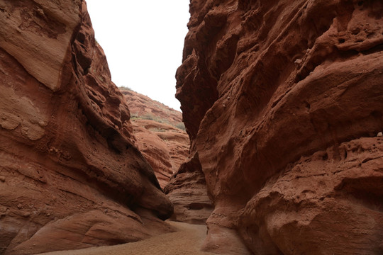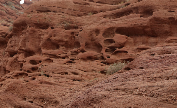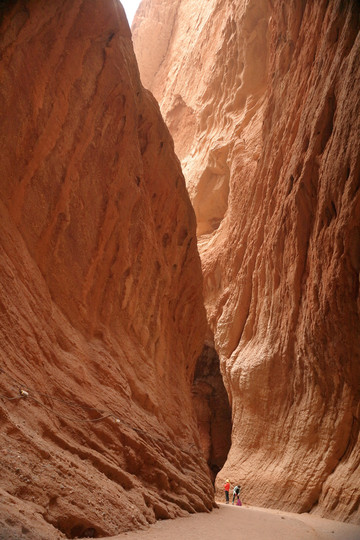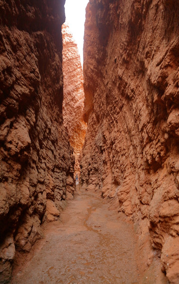 天山神秘大峡谷也叫克孜利亚大峡谷,克孜利亚维吾尔语意是“红色的山崖”,从库车沿独库公路北行60公里。从停车场就能看到鲜艳的红色山体,往里并不都那么红,峡谷时宽时窄,弯弯曲曲,两侧的岩石有沟有洞,布满了水冲刷的痕迹。有些地方不知哪儿来的水沿着山岩滴下来,就会催生出一簇簇绿毛样的植物。这里很像美国的羚羊谷,只是规模更大而且露天。有几处有指示牌的景观:神犬守谷、旋天古堡、显灵洞、玉女泉、卧驼峰等。峡谷中有一个神秘的阿艾石窟高悬于绝壁之上,据考证建于盛唐中期。石窟中有残存的壁画,最为神奇的是竟然有汉字。现在好像不开放。一路走一路看大约一个小时能走到峡谷的尽头,这里也是最窄处,前面有栅栏挡住去路,但仍有游客跳过去拍照。最窄的地方仅够一人通行,对面的人只能排队等候,这条沟底有水,踩着两边斜坡才不会湿了鞋。整个峡谷很平坦,刚进入时脚下沙子软,走起来有些吃力,里面就很好走了。进入峡谷里温度降低好几度,亮度也降低好几度。