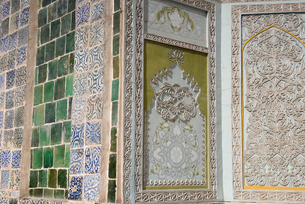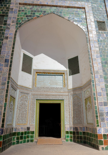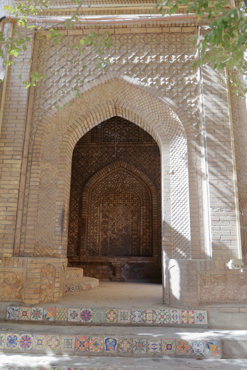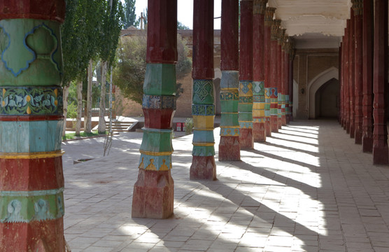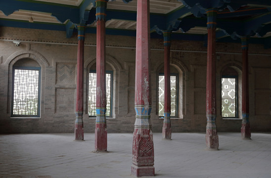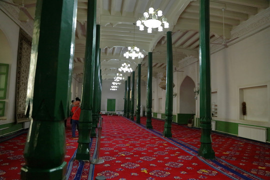 热斯坦街对面有条路,向里走二三百米就是库车大寺,它是新疆境内仅次于喀什艾提尕尔清真寺的第二大寺,人气可比艾提尕尔差远了,门口没人,进去后算上我们游客总共不超过十人。大寺门楼高18.3米,青砖砌成,崭新的门楼与宣礼塔庄严挺拔,塔柱雕着伊斯兰风格图案,穹窿式楼顶象征天宇,鲜艳的绿色大门紧闭,一副拒人于千里之外的样子。旁边一个像传达室的小房子是售票处兼入口,花15元买了票,穿过小过道进入,毫无庄严感。四方的院子好像疏于打理,西侧的礼拜大厅看似年久失修,这个1500平方米、可容纳3000人礼拜厅建在一个几层台阶的平台上,朴素又讲究,纵横8行的64根六棱形柱饰以彩雕,富有装饰性,已经斑驳了,由102块方格组成的天花板与天蓝色房梁对比鲜明,墙砖和窗格的图案做工规整。大厅看样子好久没用过了,布满了灰尘。库车大寺据传为16世纪新疆伊斯兰教黑山派首领伊斯哈格吾里从喀什到库车留居传道期间所建。初是土建寺院,17世纪改为木结构,1923年遇大火被烧毁,现存寺院为1931年建成。