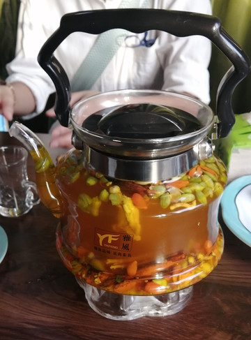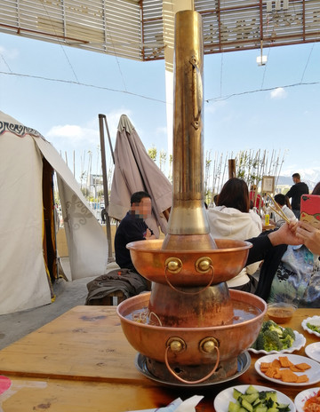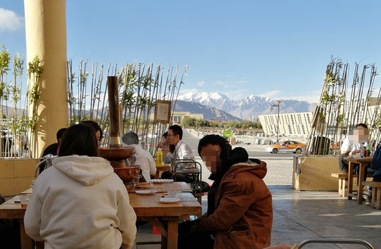 塔县的那顿饭吃得最有戏剧性。我们六点多去吃午饭,看这家号称塔县第一家牦牛火锅店位置突出,正对着雪山,门前的小院有七八张桌子,想着对着雪山吃火锅得有多浪漫,我们就选了一张坐下。点完菜,服务员端上零食,火锅也烧上了,就等着肉了。没想到等来一股妖风,瞬间吹跑了塑料盘子装的小吃和还没用的塑料碗,服务员迅速熟练地帮客人把桌上的肉和菜端进屋,一边快速地对我们说“赶紧进去找地方坐,我会把东西给你们送过去。”我开始还犹豫要不要进屋,抱着风一会儿就过去的幻想,很快就明白了这幻想有多么不切实际。看来服务员们经验丰富,训练有素。大家很快都挤进了屋里,幸好我们动作快,抢到了一张桌子,好多人站着等安排。服务员重新端上零食和餐具,随后肉也上来了,味道不如云南德钦的好,有点腥,给80分吧。