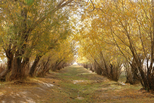 离塔什库尔干不远有个塔合曼乡,是慕士塔格峰下的宁静村庄,最著名的是一公里黄金隧道——村口的一段林荫路。我们专程早上赶过去,本来汽车可直接开进林荫道,现在可能为保护景观,汽车要绕道一条极窄的土路。土路边有几处空地可以停车,游客步行到林荫道,当地干部和民警检查证件和口罩。林荫道并没有规定不准走车,有两辆汽车在路中间拍视频,前进、倒退地折腾半天。道两旁是大片的田地和草场,有铁丝网隔着,只能远远地望着。几头牛在吃草,没见到一个人。