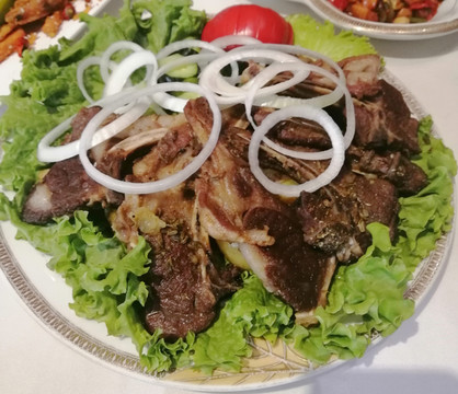 喀什的诺兰美食评价很高,确实不辜负它的好名声。这家店在将老城一分两半的解放北路上,门脸很小,我险些错过。进去却让人眼前一亮,宽大漂亮的台阶,像欧洲宫殿里的一样。上到二楼更是赏心悦目,大餐桌、沙发椅、水晶吊灯、雕花立柱、白色三角钢琴,让你无论吃什么都有参加皇家宴会的感觉。说到正题,菜基本达到中高水平,中西兼备,南北共享,餐具漂亮。羊排肥瘦正好,嫩而不膻配黄瓜、土豆和番茄,一大盘蛋白质、维生素、碳水都有了。牛肉菜汤是西式的,料足。炸虾配炸红薯,香酥微辣带甜,就是虾少了点。清蒸鸦片鱼很让我们意外,想不到在新疆能吃到这么好的清蒸鱼,蒸得恰到好处,鱼肉鲜嫩少刺。推荐的鸡丁我不太喜欢,花生皮塌塌的,偏辣。酸奶没有糖,很稠,里面好像有奶皮或奶酪。服务基本到位,只是和这环境比起来差了点品味。唯一可以说不满的是卫生间,实在不够卫生。