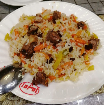 再帕尔美食城在库车有三家店,我们去了两家。小商铺街上这家与周边环境相比很突出,高大的门楼,结实的石柱,门口巨大的烤炉,就像贫民窟里的财主。目前门前的街道在挖沟施工,又脏又难走。内部装修是西域风格,可以感受到当时花了很多心思和财力。可惜现在显出破败。菜做得不错,尤其是手抓饭,是我此次新疆行吃到的最难忘的一道菜。咸度、甜度、油量和牛羊肉及米饭的软硬度都合适。羊肉串也是高水平。干煸豆角加了好多芝麻和花生,香味十足,花生酥脆,要是豆角再烂些就更好了。服务员态度和气但不主动,可能语言有些障碍,但有求必应。天山西路这家位置很好,同样高大的门楼,西域的风格,门口一个巨大的烤炉。这家装修比较新,店面大,很干净。酸奶味道很好,无糖,不够细腻,有些小颗粒,放的干果很提味。点了馕坑肉,吃过才知道味道上和羊肉串差不多,只是馕坑肉有骨头,以后还是吃羊肉串吧。鸽子拌面一大盘,我们三个人没吃完,青红辣椒既增加味道也是点缀,看着就引发食欲。鸽子肉紧实且嫩,只是有骨头,吃着麻烦。服务员热情周到,很有眼力见儿。