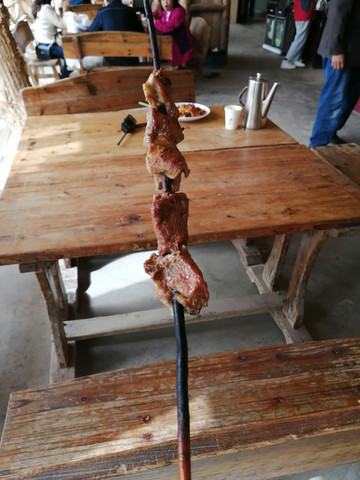 景点的饭都比较粗糙,很可能是当地村民做的。红海胡杨林公园的湖边餐馆气氛不错,桌子和长条凳是粗厚的原木做的,可以边吃饭边赏景。饭菜就不敢恭维了,手抓饭里料很少,味道更是与再帕尔美食城的没法比。羊肉串里骨头太多,肉老得嚼不动。而罗布人村的餐馆就过于简陋了,不能叫餐馆,就是一个大棚,提供包子、手抓饭、羊肉串等几样食物,包子是提前做好的,在我要求下用微波炉加热了一下,一点不好吃。羊肉串也烤糊了。
