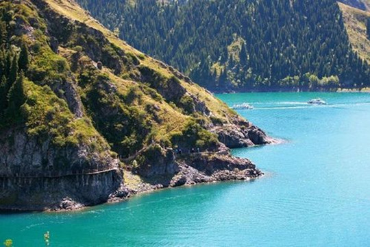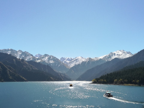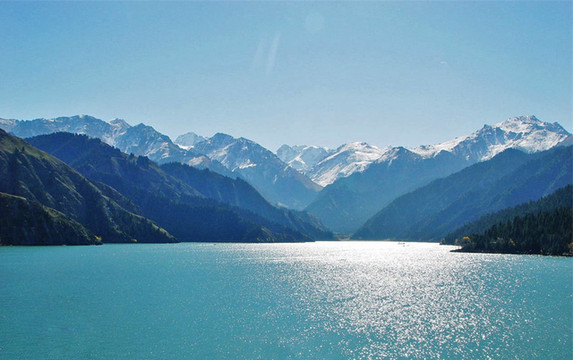 天山天池属冰碛堰塞湖,古称“瑶池”。地属新疆昌吉州阜康市,东天山主峰博格达峰北坡,距乌市110公里。是一处以高山湖泊为中心的著名旅游风景区。天池海拔1980米,南北长3.5公里,最宽处1.5公里。传说三千年前西周穆天子曾在此与西王母欢筵对歌,故留下“瑶池”美誉。天池雪峰倒映,云杉环抱,碧水似镜,风光如画,景色非常秀丽。现为AAAAA级旅游景区、国家地质公园等,2013年被列入世界自然遗产名录。
