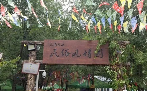 天池门票站到天池还有30多公里,途中有天镜神池民俗园、石人沟、雪海三峰观赏点。坐上景区交通车,一路听讲解员介绍当地民俗风情。第一站就来到了民俗园。感觉这里就是个集餐饮、购物、即兴歌舞表演等名目繁多小而全的“小巴扎”,大概是个天山天池旅游派生的“副产品”。